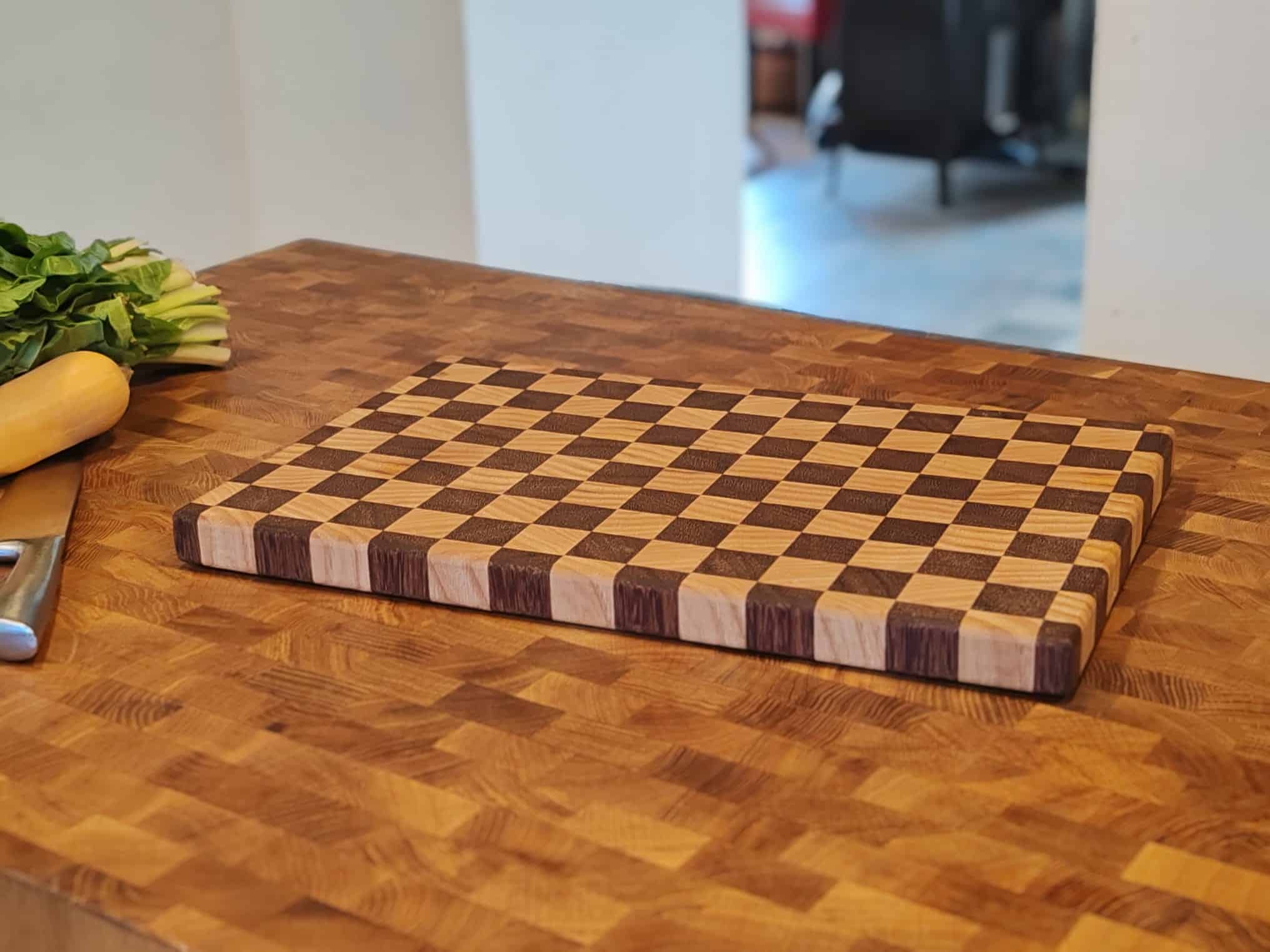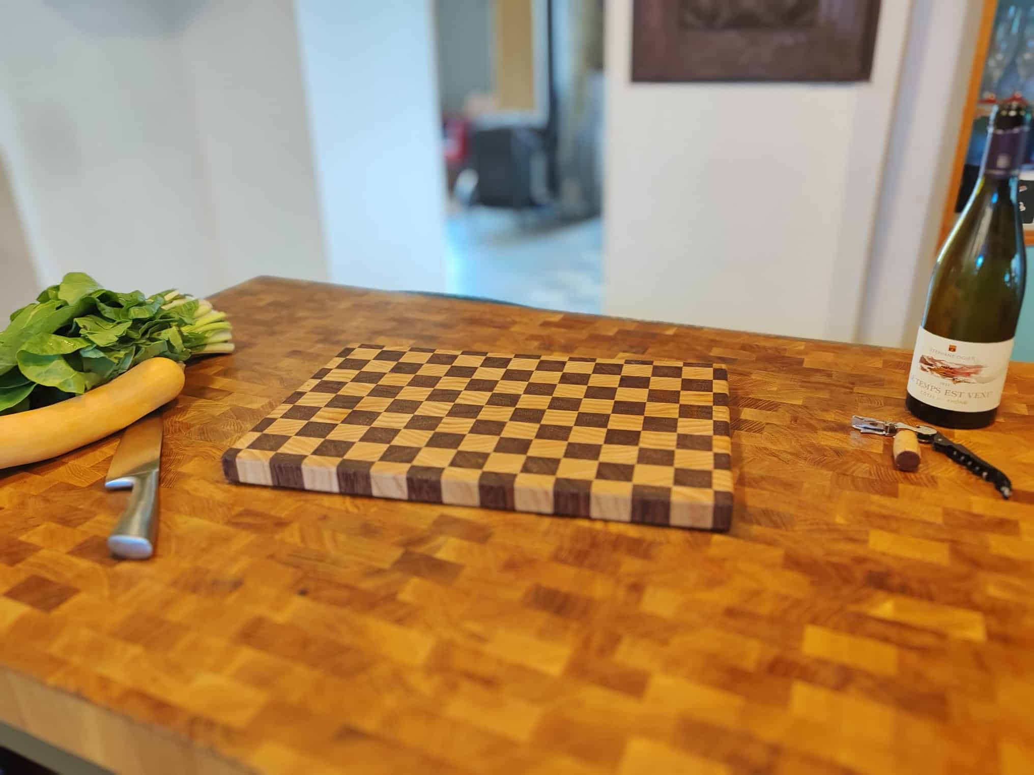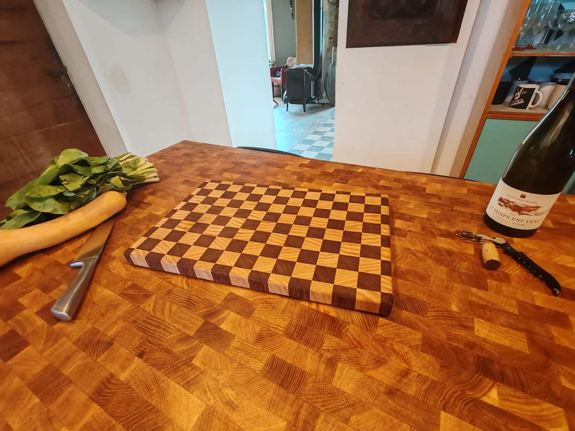 Ce billot est notre compagnon lors de la préparation de nos chefs d’œuvres culinaires! Réalisé pour notre famille, il réunis nos territoires, avec un bois provenant de Guyane et le second en châtaignier (Notre maison s’appelle Gathania, châtaigneraie en langue basque). Réalisé en bois de bout en valorisant des chutes de bonnes qualités.